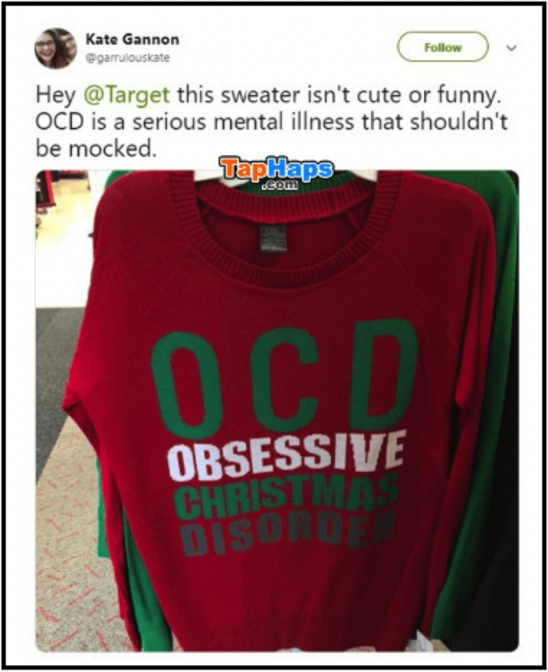 On the T-shirts was written “OCD Christmas obsessive-compulsive disorder”, and the woman says that this message is offensive to people who really suffer from this disease that can be quite serious and can affect the activities of a human in daily life.