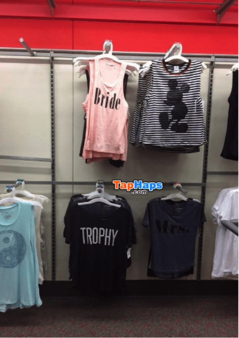 For example, one person was offended by the T-shirts below that read “bride,” “trophy,” “mrs.” and considers it inappropriate because the figure of a woman is not an object that can be bought.